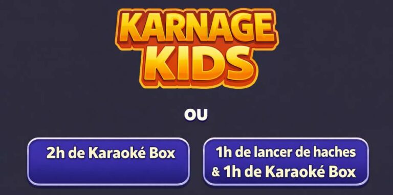 Notre formule “Karnage Kids” réunit du lancer de haches et de shurikens adaptés aux enfants, du Karaoké Box privatisé, des boissons à volonté, un goûter XXL à base de donuts et de bonbons, le tout dans un environnement sécurisé. C’est une solution clé en main, où les parents n’ont qu’à réserver le créneau : nous nous occupons du reste.
